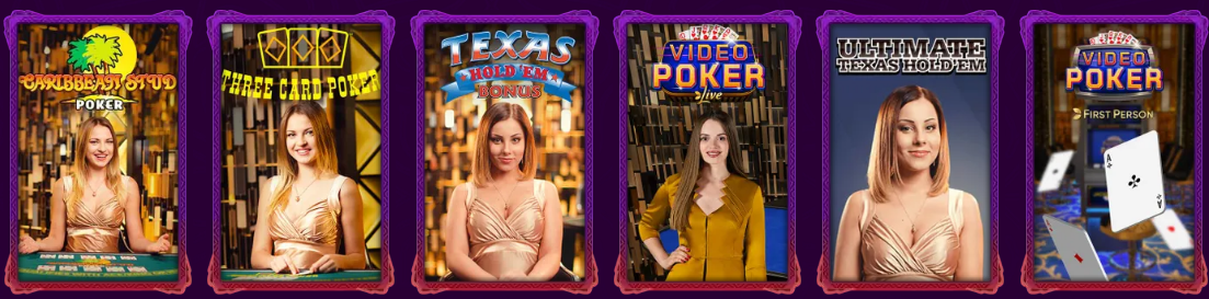 - Video Poker (en vivo y First Person) – mezcla de slot y póker, con diferentes modalidades (Jacks or Better, Deuces Wild, etc.).