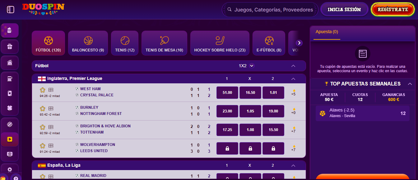 DuoSpin no solo destaca por su casino online, sino también por la sección de apuestas deportivas y virtuales. Aquí, los usuarios pueden apostar en simulaciones realistas de fútbol, baloncesto, tenis, hockey sobre hielo, e-fútbol y más. Estas disciplinas virtuales funcionan con resultados generados por algoritmos certificados, lo que asegura imparcialidad y dinamismo.