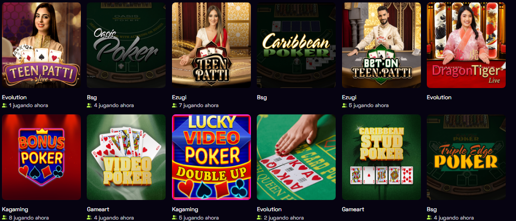 - Póker en vivo: Teen Patti y Bet on Teen Patti con crupieres de Evolution y Ezugi; también hay títulos afines como Dragon Tiger.