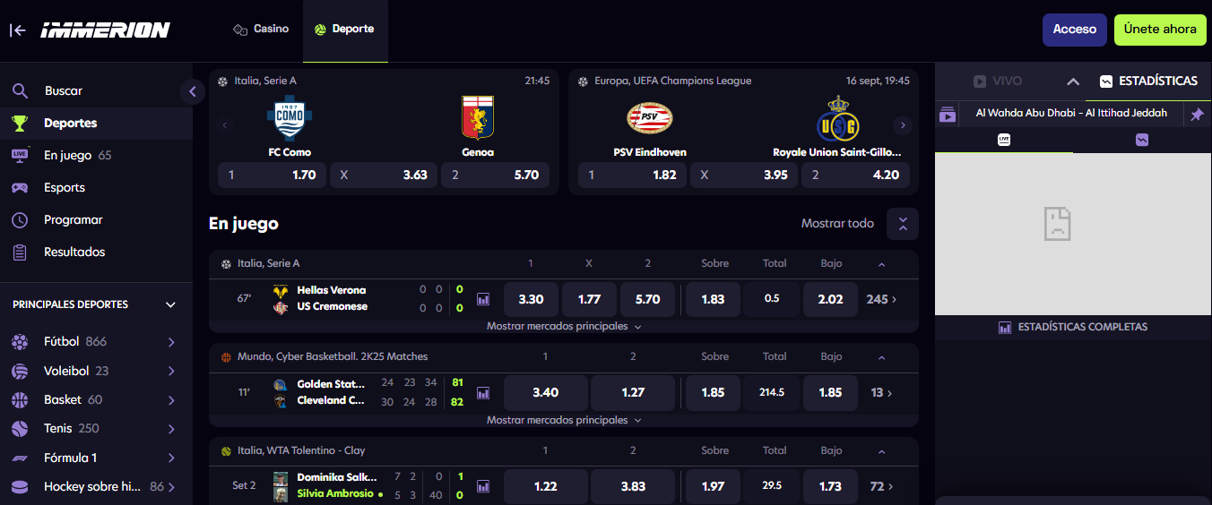 Los deportes virtuales de Immerion simulan competiciones con resultados generados por RNG y eventos cada pocos minutos. Tienes cuotas en tiempo real, mercados habituales (1X2, hándicap, totales) y panel de estadísticas para decidir rápido. Ideal cuando no hay partidos reales o buscas acción continua.