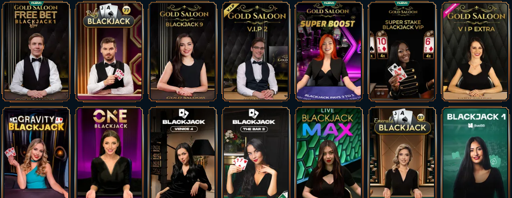- Variantes y mesas destacadas: se encuentran formatos como Free Bet, ONE Blackjack, Gravity Blackjack, Super Stake y mesas VIP/rápidas (según el catálogo visible en tu material).