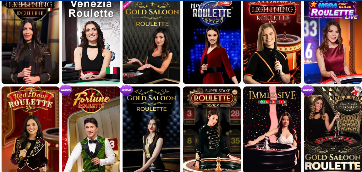 - Mesas en vivo destacadas: Lightning Roulette, Immersive Roulette, Mega Roulette, Mega Fire Blaze Roulette Live, Super Stake Roulette 5000x, Venezia Roulette, Red Door Roulette, Fortune Roulette, Gold Saloon Roulette.