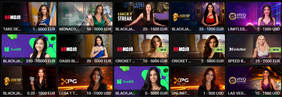El blackjack de WinWin está disponible en RNG y en vivo con crupieres de estudios líderes (p. ej., Evolution, Winfinity, Amusnet, Vivo, XPG). Encontrarás mesas clásicas 3:2, formatos Speed/Instant/Unlimited (Infinite), VIP con límites altos y variantes modernas como Free Bet o Power. Los límites cubren desde apuestas micro hasta high-roller, también con opción Bet Behind en vivo.