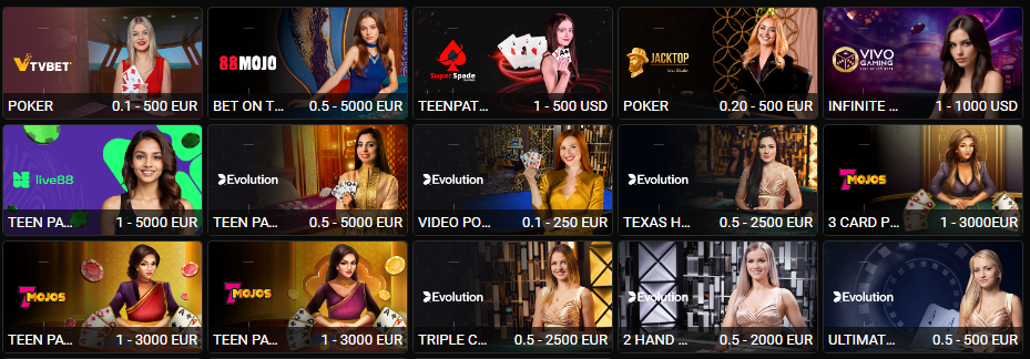 - Juegos de mesa (RNG): múltiples variantes de ruleta, blackjack, baccarat y póker de casino con límites flexibles.